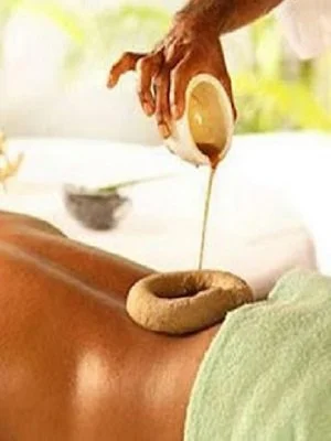 Specially prepared warm herbal oil is poured over the lower back and retained over lumbosacral junction